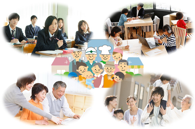 政府自治体、学校、保護者、直接教育に関わる人が主に責任を持つことは当然のことながら、地域や企業が教育に関わり、責任を共有することが望まれています。