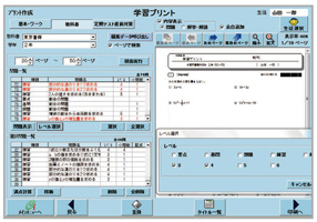 教科書ページ検索機能付き。単元項目も連動。マウスでもバーコードでもプリント作成できるため便利。