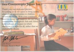 『ルーム・トゥ・リード』より感謝状をいただきました