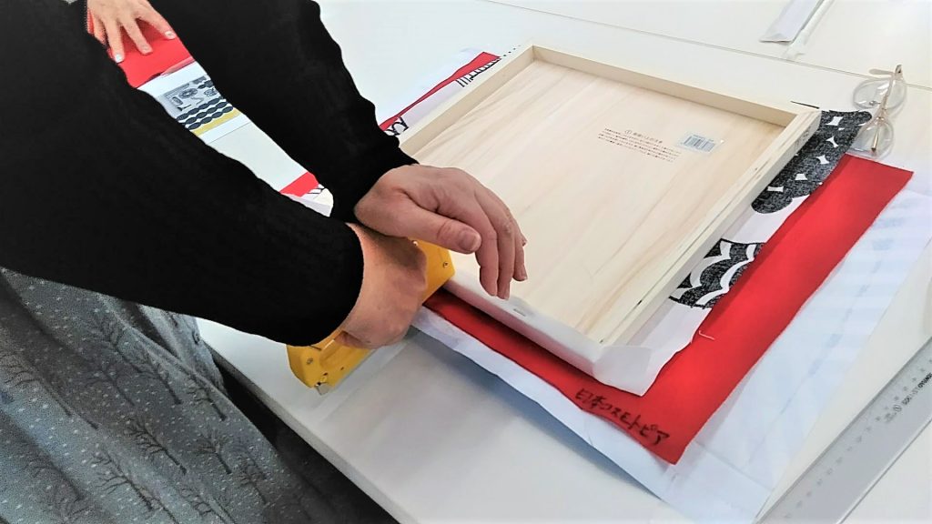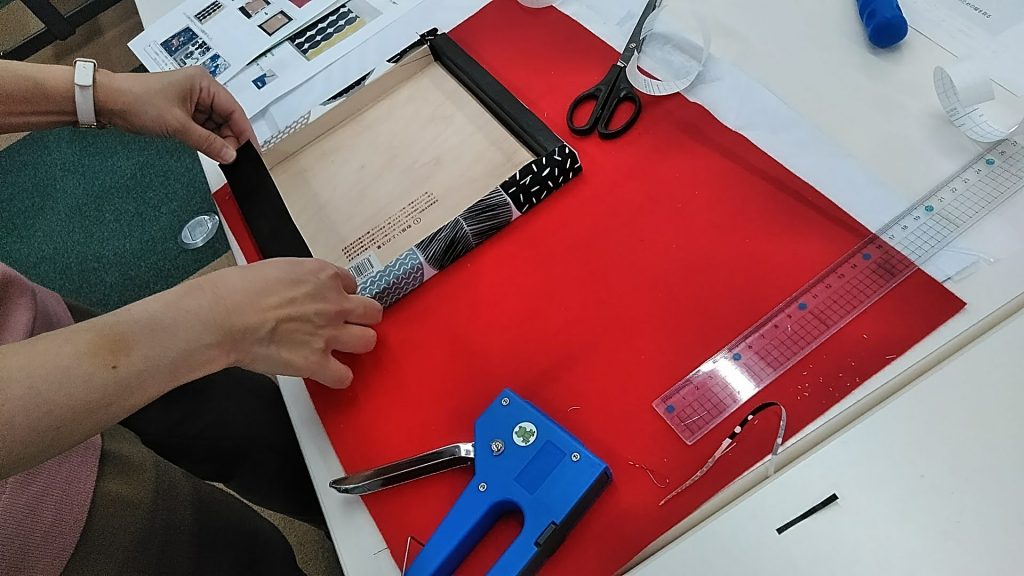 ③布を裁断し、タッカーで留める(タッカーがうまくいかないと、たちまちペンチや金づちが登場するガテン系ワークショップになります…)