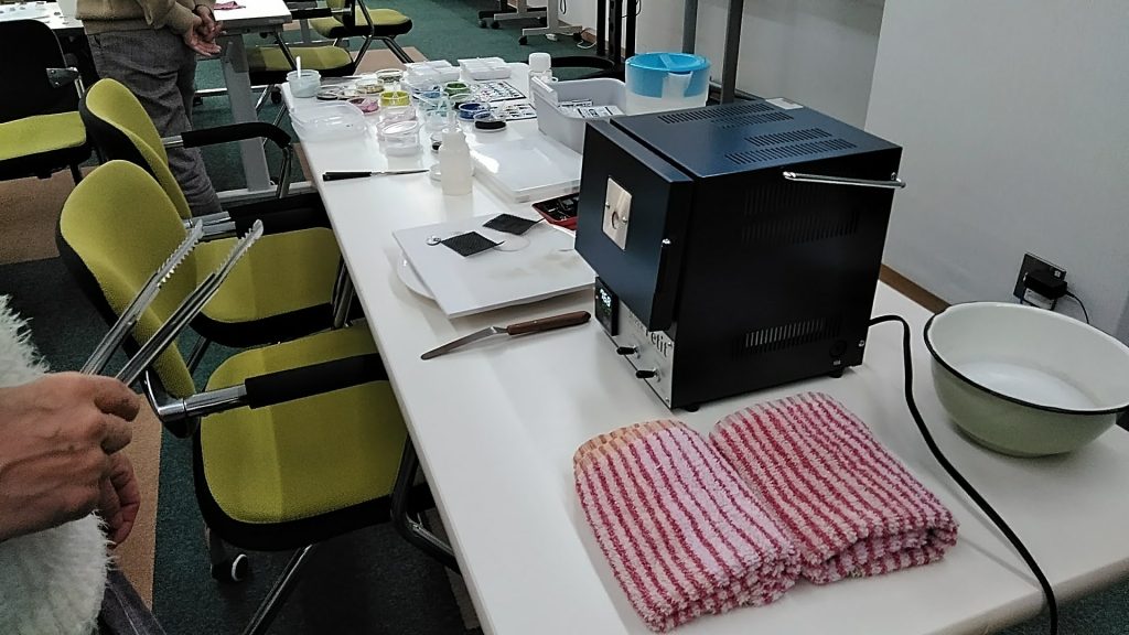 これが焼き上がり!え?真っ黒では?っと思ったあなた、動画をしばらくご覧ください。温度が下がるときれいな色が浮かび上がってきます。ここが七宝焼きの醍醐味!